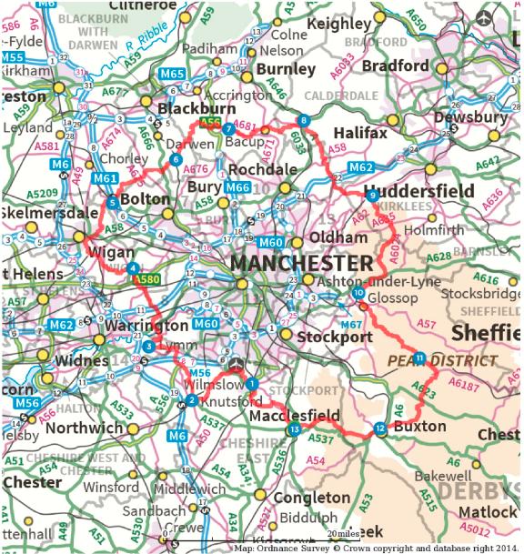 A 157 mile walking route that encircles the City of Manchester in 13 stages, each accessible by public transport, and taking in as much as possible of the best scenery on the way.