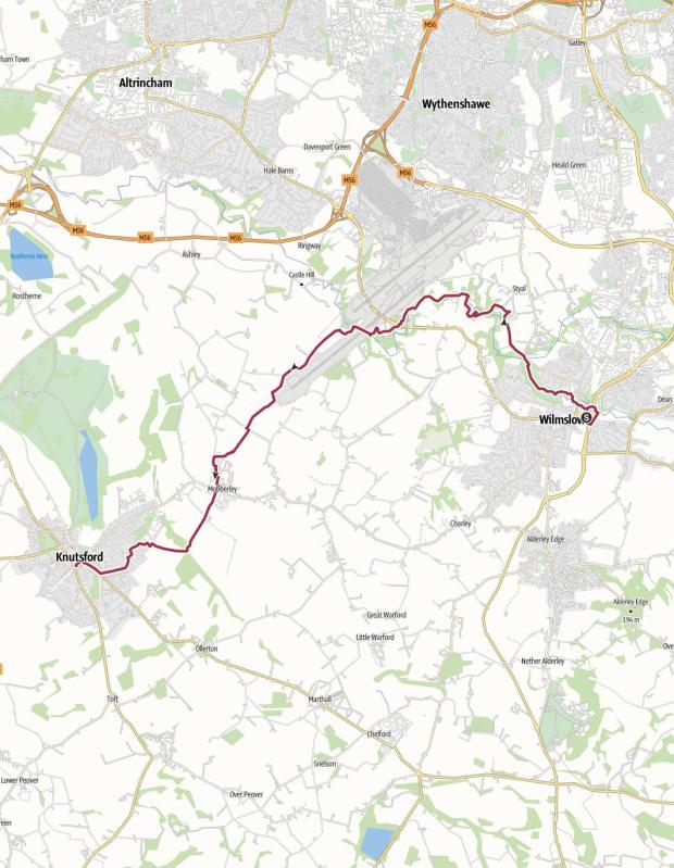 Waypoints: Wilmslow Railway Station – North Cheshire Way – Quarry Bank Mill – Giant’s Castle – Manchester Airport Runway 2 – Wood Lane – Hobcroft Lane – Smith Lane – Mobberley Village – Pavement Lane – Longridge – Brookdale Avenue – Higher Downs – Sparrow Lane – A537 – Knutsford Railway Station