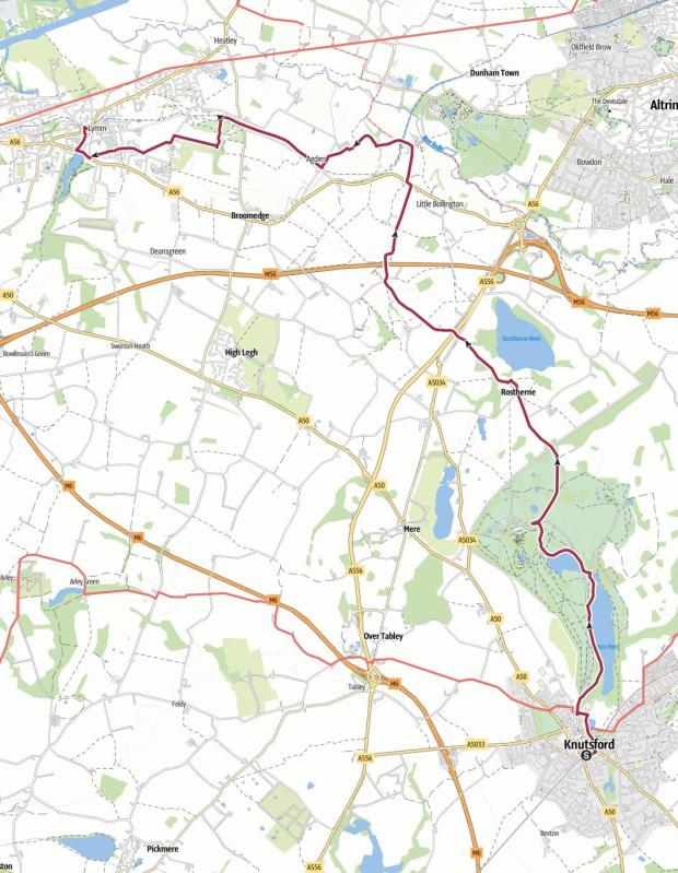 Waypoints: Knutsford Railway Station – Moorside Park – Tatton Park Main Entrance – Tatton Hall – Rostherne – Newhall Farm – Booth Bank – Reddy Lane – Little Bollington – Woolstencroft Farm – Bridgewater Canal – Spud Wood – St Peter’s Church, Oughtrington – Lymm Dam (A56) – The Dingle – Lymm Cross