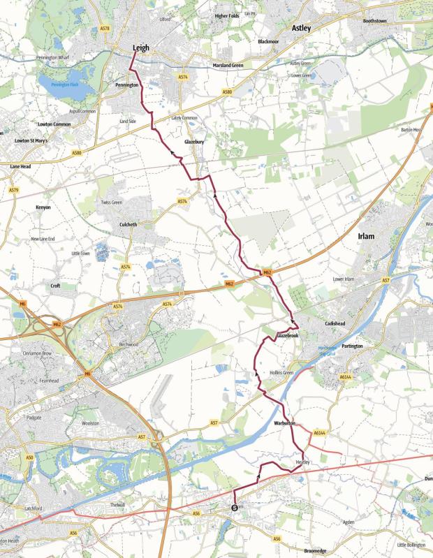 Waypoints: Lymm Cross – Trans Pennine Trail – Reddish Lane – Townfield Lane – Warburton Bridge – Hollingreave – Glazebrook Post Office – The Glazebrook Trail – Great Woolden Hall – Little Woolden Hall – Moss House Farm – Light Oak Bridge – The George & Dragon, Glazebury – Duckinfield Farm – Old Field Farm – Pennington Brook – Christ Church, Pennington – Leigh Bus Station
