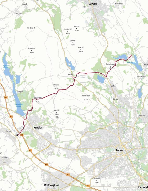 Waypoints: Blackrod Railway Station – the B5238 (Crown Lane) – paths to the River Douglas – Squirrel Lane – Jepson’s Bridge – Roynton Road – the Japanese Garden – Rivington Tower – Winter Hill TV Transmitter – The Black Dog, Belmont – Lower Whittaker – Broad Hill – Dimple – the Turton Heights – Green’s Arms Road – Turton & Entwistle Reservoir – Entwistle Railway Station