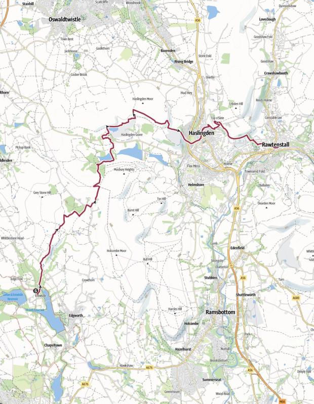 Waypoints: Entwistle Railway Station – Wayoh Farm – The Naze – Longshoot – Broadhead – Uglow Farm – Hog Lowe Pike – Calf Hey Reservoir – Clough Head Visitor Centre – The Rossendale Way – Haslingden Moor – Cob Castle Road – Hutch Bank – Charles Road – Deardengate – Hargreaves Mill – The Haslingden Halo – Height End – Whitaker Park – St Mary’s Church – Rawtenstall Bus Station