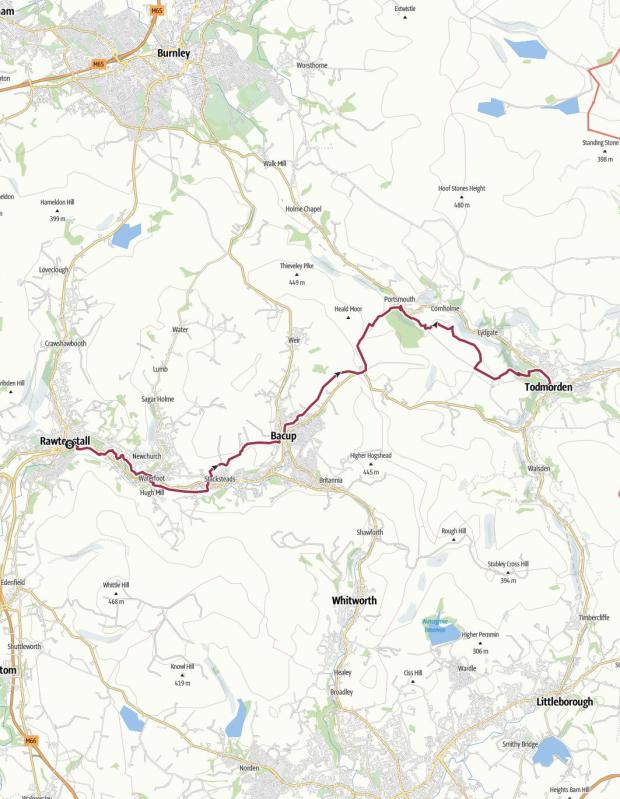 Waypoints: Rawtenstall Bus Station – River Irwell – Clough Foot – Rawtenstall Wood – Waterfoot – The Newchurch Tunnels – Brandwood – Tunstead – Whitegate Farm – Bacup Golf Club – Lane Head – Todmorden Old Road – Slate Pit Hill – Green’s Clough – Beater Clough – The Roebuck PH – Carr Road – Height Top – Roundfield – New Towneley – West End – Sourhall Cottages – Todmorden Edge Farm – Sigget Lane – Lovers Lane – Centre Vale Park – the A646 – Todmorden Railway Station