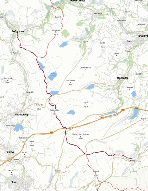 Waypoints: Todmorden Railway Station – Salford – Rake End – Gaddings Dam – Warland Drain – The Pennine Way, via the White House, Blackstone Edge, the M62 footbridge crossing and White Hill – Bridleway towards Marsden – Close Gate Bridge – Waters Road – Tunnel End – Marsden Railway Station