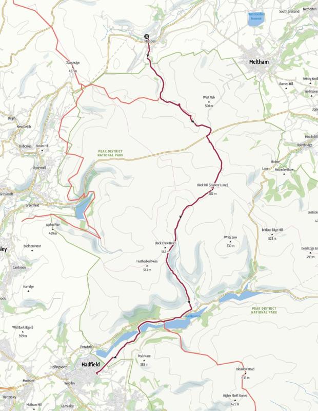 Waypoints: Marsden Railway Station – Kirklees Way – Pennine Way via Black Hill and the Laddow Rocks to The Hollins – Rhodeswood Dam – Deepclough Farm – footpath parallel to the Longendale Trail for ½ mile – The Longedale Trail – Hadfield Railway Station