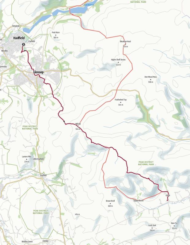 Waypoints: Hadfield Railway Station – Castlehill Wood – Hilltop Farm – Higher Dinting – Surrey Street – Shrewsbury Street – Harehills Park – Glossop Market – Gladstone Street – Cliffe Road – Brownhill Farm – Bray Clough – Shooting Cabin – Mill Hill (where we join the Pennine Way) – Sandy Heys – Kinder Downfall (where we leave the Pennine Way) – Kinder Gates – across the moors to Crowden Head – Grindslow Knoll – Grindsbrook Booth – Edale Railway Station