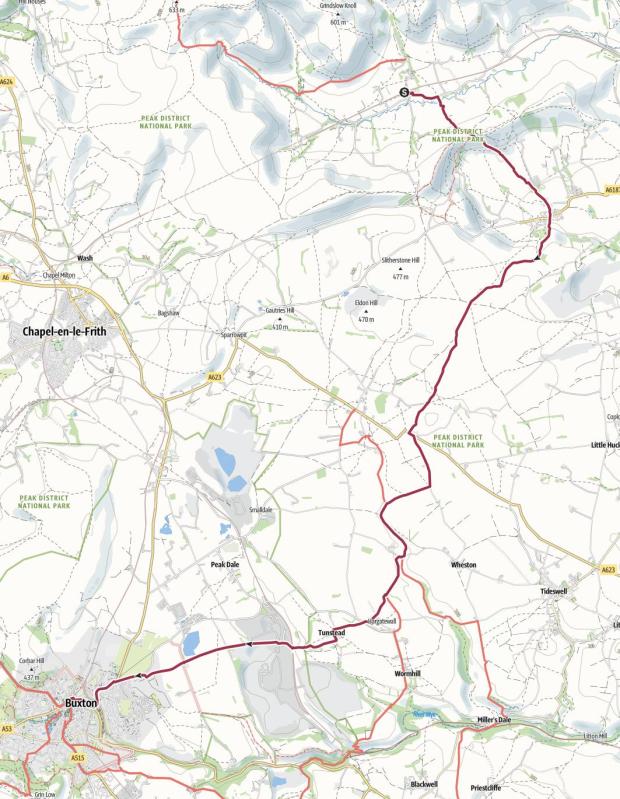 Waypoints: Edale Railway Station – Hollins Cross – Castleton – Cave Dave – the Limestone Way – Hay Dale – Hargatewall – the Tunstead Works – Green Lane – Waterswallows Road – the A6 – Buxton Railway Station